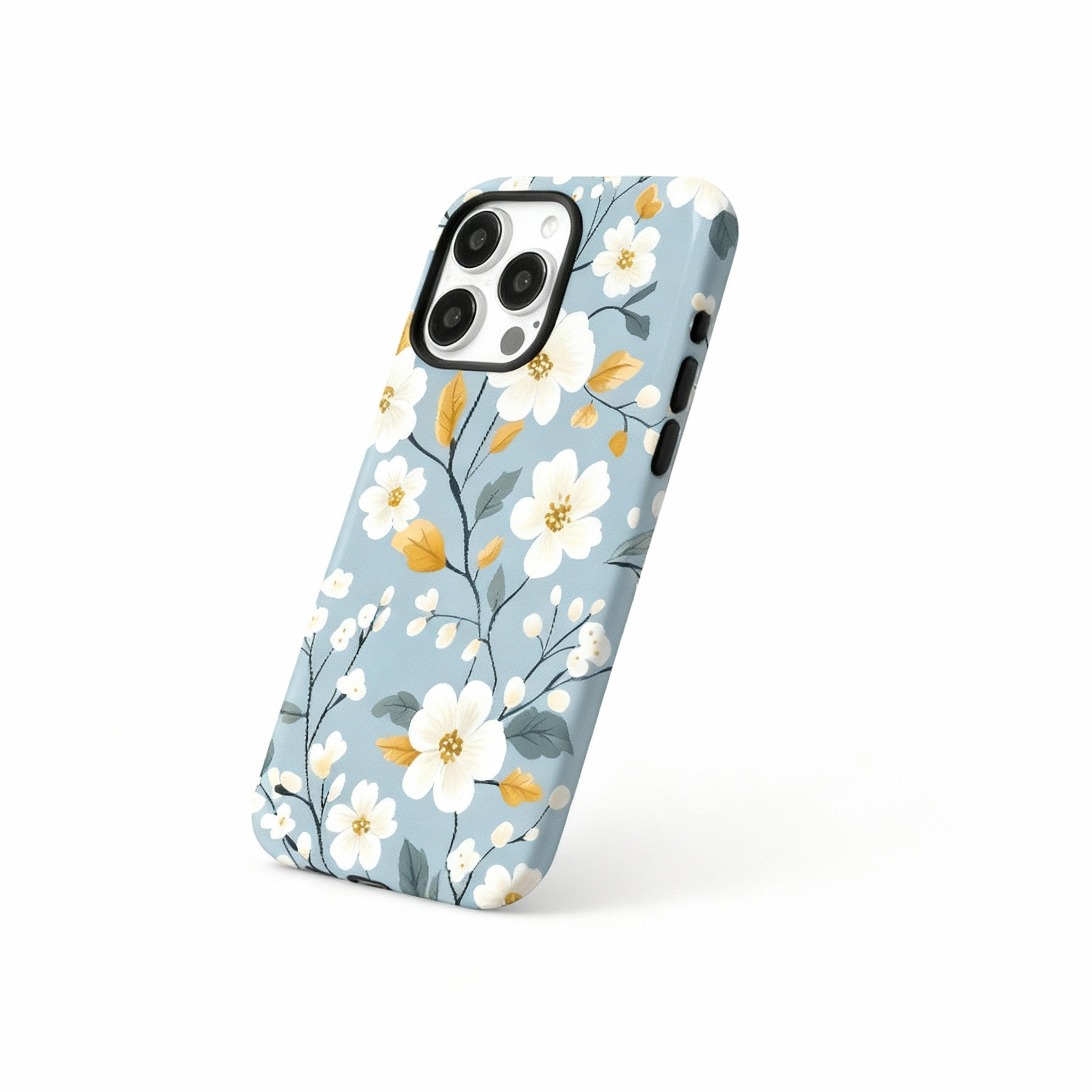 Bring the serenity of a spring garden to your fingertips with the Wagmade Sky Blue Floral Case. This design features elegant white blossoms and delicate golden-yellow leaves dancing across a calming sky-blue background. It is the perfect blend of cottagecore charm and modern elegance.