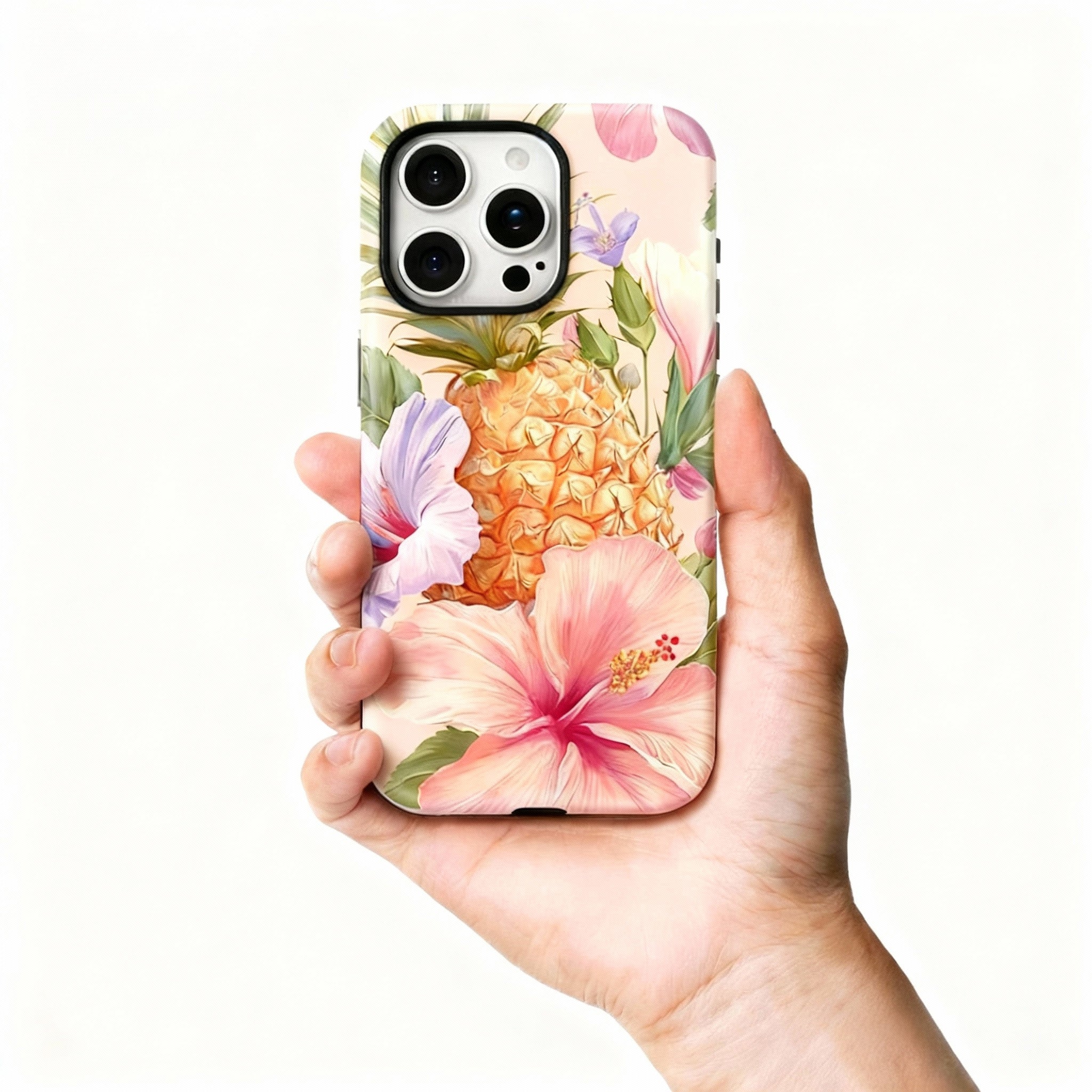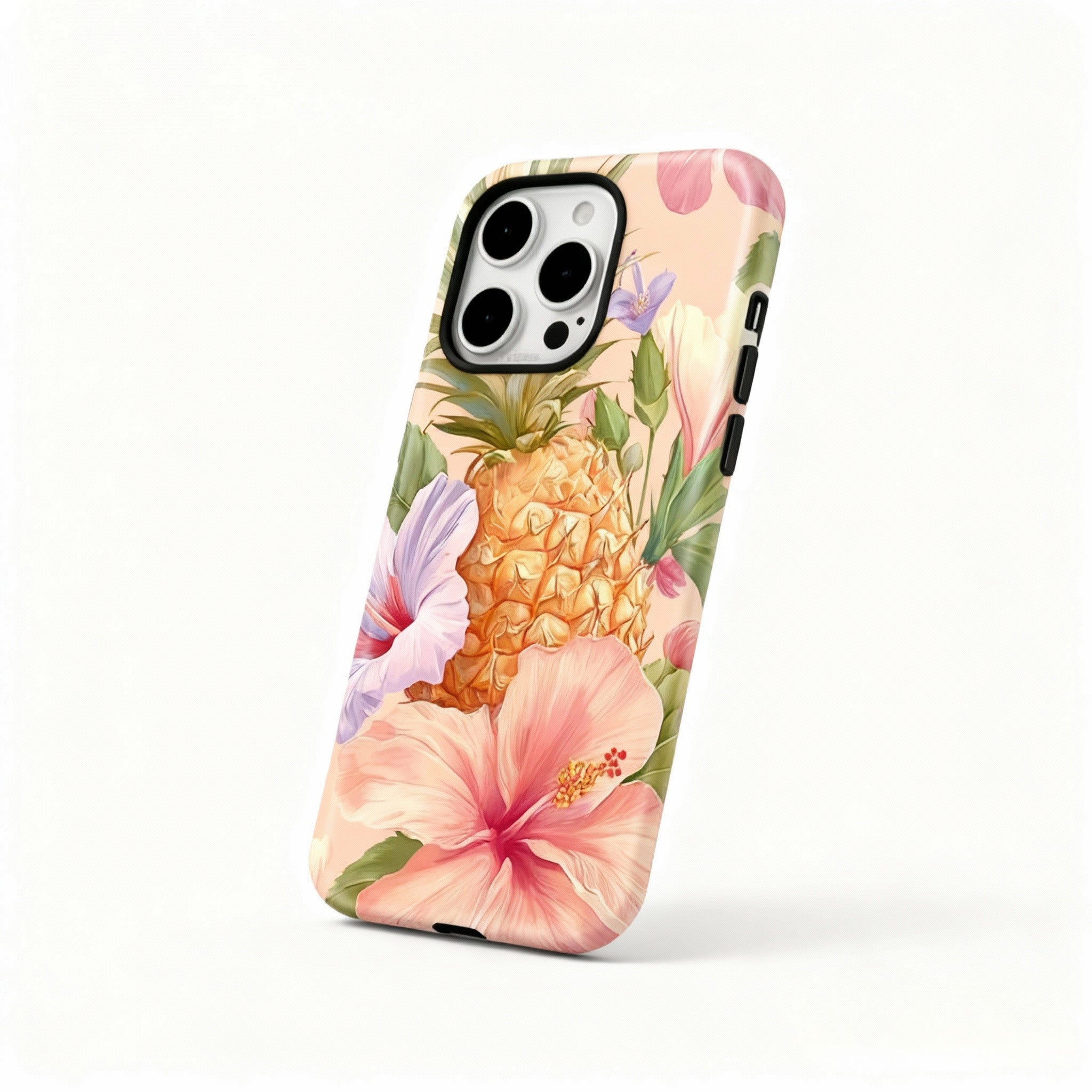 Escape to a sun-soaked paradise with the [wagmade] Tropical Paradise Case. Featuring a vibrant, watercolor-style golden pineapple surrounded by blooming pink and purple hibiscus flowers on a soft peach backdrop, this case turns your iPhone into a daily dose of summer.